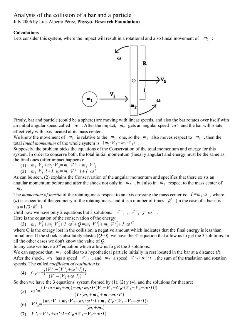 Below is a calculation by Luis Alberto Pérez analyzing a system where a ball collides with a bar, sending the second into translational and rotational motion: