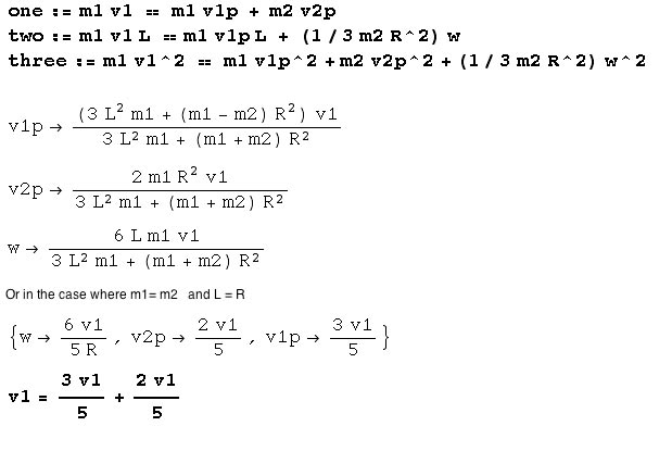 This is most evident in a simplified situation where in its initial state, the ball moves but the bar is stationary, where v1p and v2p and w are the final velocities of the ball, the bar, and the rotational frequency of the bar. Here are the mathematica-formatted equations: