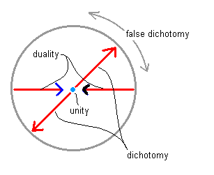 The following diagram shows the relationship between unity, duality, dichotomy, and false dichotomy in the circle analogy:
