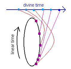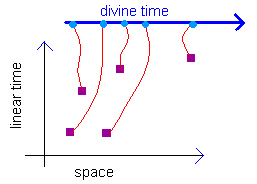 This diagram shows that spiritual evolution is linear on the scale of non-absolute divine time. Things go out of sequence and causality or spatial duality is no longer a concern when it comes to linear time, however. Points along the path of divine time and spiritual evolution are matched up with corresponding incarnations in linear space and time.