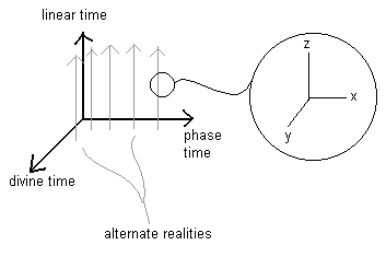 Associated with each type of consciousness is a dimension of time. Base level consciousness creates linear time, individual consciousness creates phase time, and divine consciousness creates divine time.