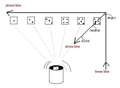 And for each possibility, the outcome will be interpreted differently depending on the spiritual evolution of the being; a rock or animal would not understand it, a sore loser would get angry at a poor roll, and a more evolved human would see it only as a game – the dimension measuring the difference between these levels of interpretation is divine time.