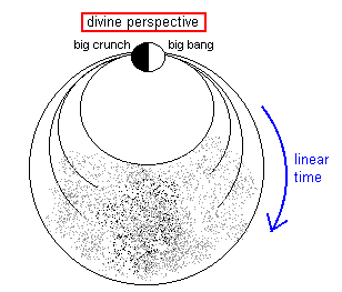 From the perspective of divine time, the entire universe and all its alternate versions came into existence at a single moment. One may think of the universe as a circle, with Big Bang and Big Crunch being two halves of the same point atop the circle.